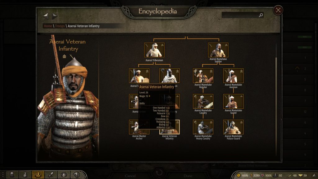 Par exemple, si nous prenons l’Aserai Veteran Infantry en comparaison au Khuzait Darkhan, nous remarquons que le premier maîtrise mieux les armes à deux mains alors que le second a un avantage à cheval. Un joueur avisé gardera cela en tête. Cependant, si vous êtes débutant, ne vous acharnez pas sur ce point. Cela se fera de toute manière avec le temps. Mais jetez-y un coup d’œil de temps en temps, vous pouvez avoir de bonnes surprises.
