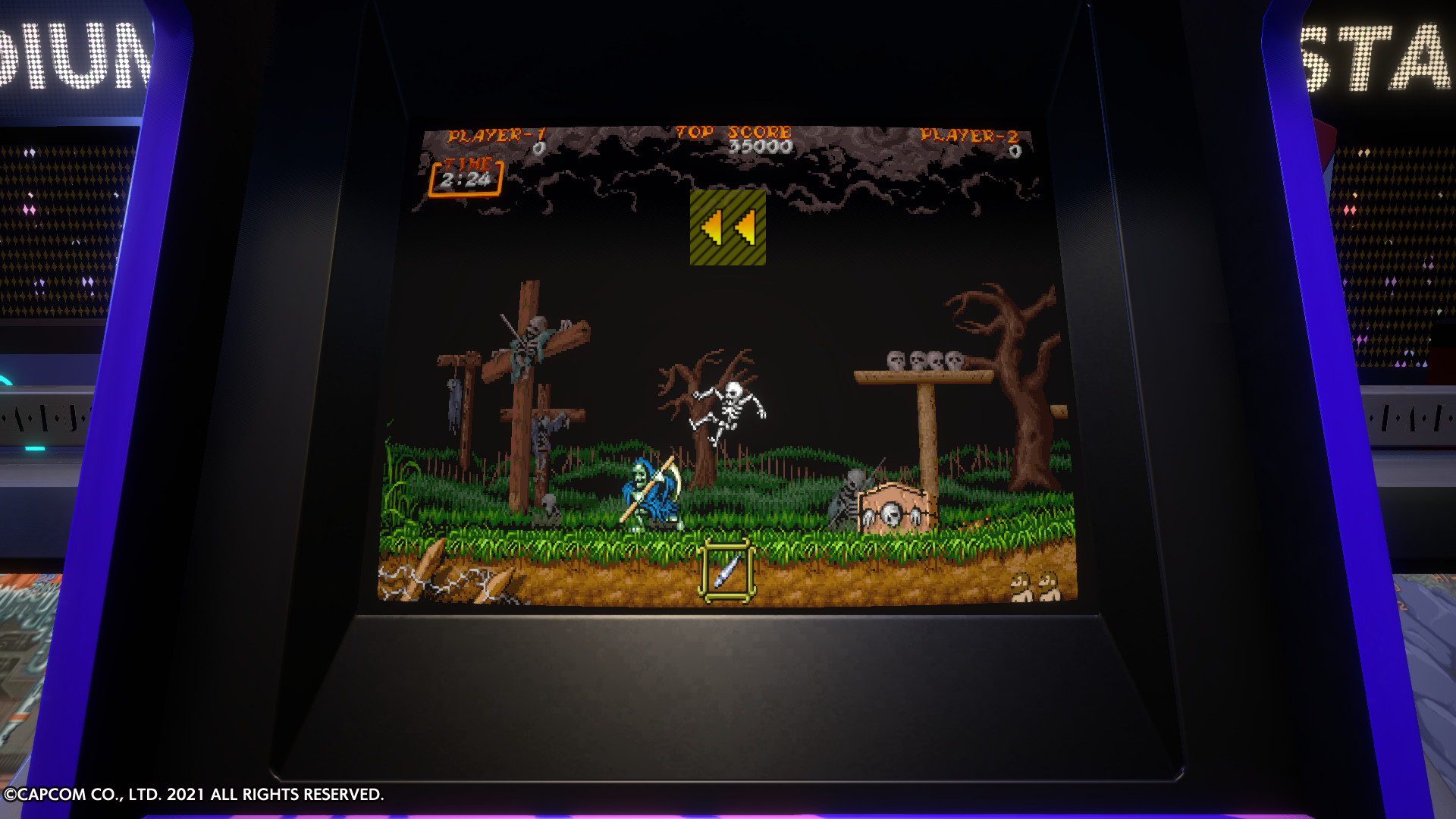 Passons désormais à la jouabilité et aux caractéristiques de Capcom Arcade Stadium. Pour ce qui est du gameplay pur et dur de chaque jeu, il est authentique et toujours aussi frénétique, chaque portage étant fidèle, de quoi bien s’amuser si on est féru d’action. Là où la compilation devient réellement intéressante, c’est au niveau des options. Tout est là pour contenter le joueur : manuel de jeu, explications, la possibilité de sauvegarder à tout moment, on peut rembobiner une action, jouer au ralenti ou au contraire accélérer le tempo, pièces à l’infini (car oui, il faut mettre des pièces pour jouer mais soyez rassurés, vous n’avez pas à sortir votre réel porte-monnaie)… Ainsi, chacun peut jouer comme bon lui chante – d’ailleurs, outre la manette, il y a également l’inclusion de la jouabilité au stick, sensations authentiques garanties – et se vanter par la suite d’avoir par exemple enfin pu finir une run complète de Ghouls’n Ghosts sans se faire toucher une seule fois. C’est peut-être de la triche mais c’est autorisé. Pour couronner le tout, il y a plusieurs défis à relever, des succès/trophées à obtenir et du classement en ligne pour prouver au monde entier votre valeur.