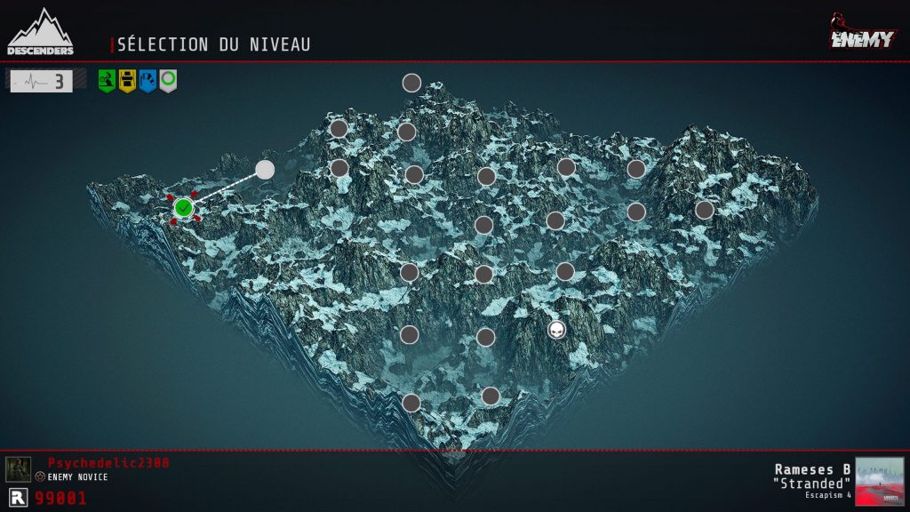 Simulation de VTT de descente, Descenders ne se contente pas du peu et dénote un véritable souci de la part des développeurs de faire de ce titre une petite référence dans le milieu. Le concept du jeu est relativement simple : pour chaque session, le joueur explore une région composée de plusieurs nodes (point indiquant une course) tout en disposant d’un nombre donné de vies. Généré aléatoirement, chaque node représente un parcours aux particularités diverses. L’un peut être plus pentu qu’un autre, ou plus sinueux que le précédent. Dans tous les cas, il faut finir le parcours que l’on décide nous même et essayer d’accomplir l’objectif bonus proposé pour gagner une vie. Ce qui est très important quand on sait qu’une chute peut nous faire perdre 1 ou 2 vies, et si nous n’en avons plus la session est terminée.