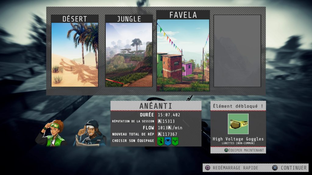 L’autre petit bémol que l’on pourrait soulever est le manque de contenu assez flagrant du côté de la bande musicale. Chaque région possède une playlist qui lui est propre, mais chacune d’entre elles ne comporte que 4 voire 5 titres. La plupart ont des sonorités electro et rythment les descentes agréablement, sans pour autant être marquantes et enthousiasmantes. D’autres avec une rythmique plus douce nous ont davantage attiré. De ce fait, et on en va pas se le cacher, on a vite l’impression que l’ambiance sonore tourne en rond. C’est dommage surtout quand on sait que l’on va devoir recommencer plusieurs fois des régions avant de réussir la bosse finale. Même si on se surprend à porter de l’attention à la playlist en découvrant pour la première fois une région, on l’oublie très vite et elle ne marque malheureusement pas nos oreilles ni l’expérience du jeu. Dommage, ça aurait un petit plus agréable.
