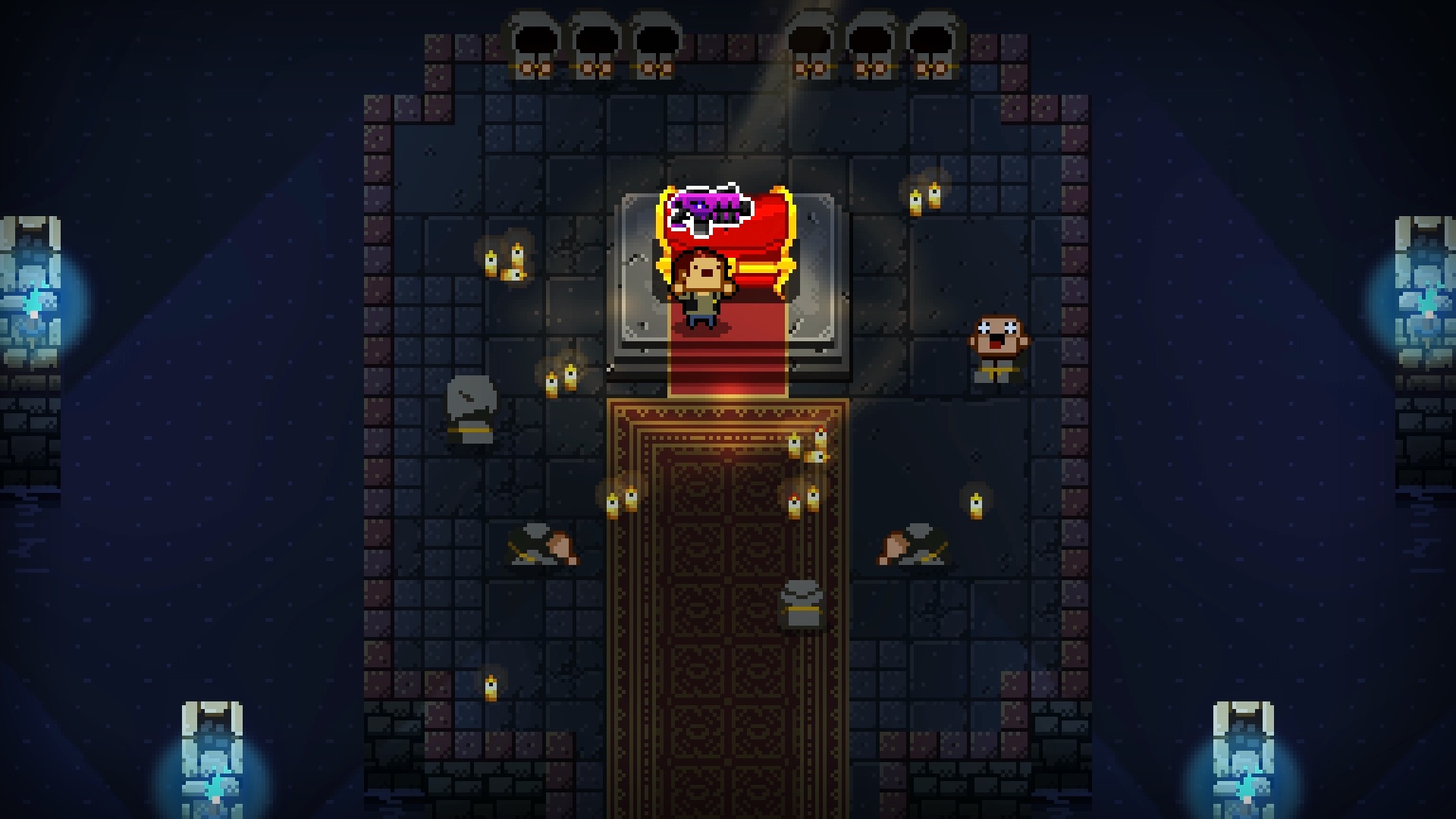 En début de ce test, nous évoquions les influences claires du jeu, à savoir The Binding of Isaac et Nuclear Throne. En effet, à la manière du titre signé Edmund McMillen, il vous faudra à chaque partie descendre dans un donjon généré aléatoirement, afin d’atteindre au fil des étages un boss final. A chaque niveau du donjon, un boss intermédiaire vous attendra et vous offrira en cas de victoire des armes et bonus bienvenus. Mais la ressemblance ne s’arrête pas là, puisque le jeu regorge de références à The Binding of Isaac : On pense par exemple dans la grande diversité d’armes et compétences à récupérer, ou encore dans la manière de faire des sacrifices d’armes ou de coeurs pour obtenir des avantages (similaires aux deals avec le Diable dans Isaac). Une bonne chose en soi, d’autant que cela s’intègre parfaitement au jeu.