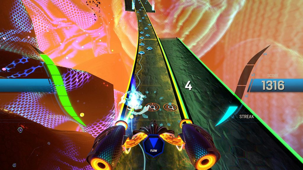 Amplitude est un jeu de rythme solo basé sur un concept sci-fi. Nous pourrons également y retrouver un mode multi coopératif et compétitif.