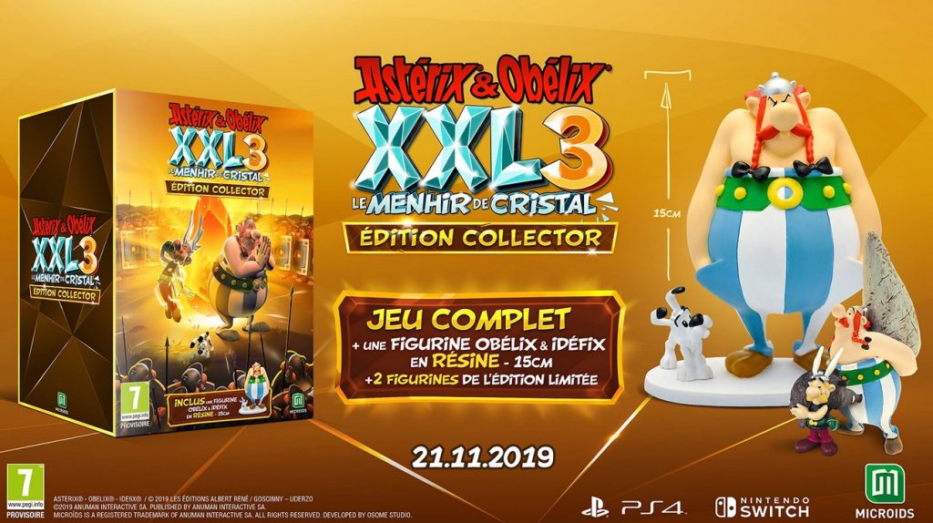 Qui dit date de sortie dit également éditions spéciales et la nouvelle aventure de nos Gaulois préférés en aura 2, à savoir une Édition Collector à 79,99€ (mais seulement pour ceux qui possèdent une PlayStation 4 et/ou une Nintendo Switch) incluant une grande figurine d’Obélix et d’Idéfix ainsi que 2 figurines présentes également dans la seconde édition, l’Édition Limitée à 49,99€ :