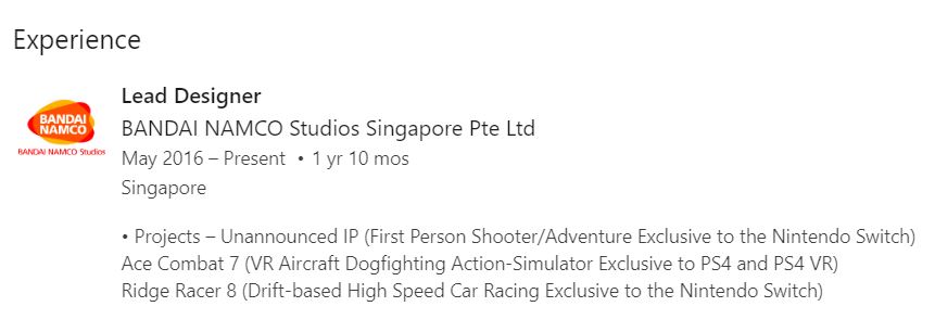 Ce développeur travaille chez le studio Bandai Namco de Singapour. Depuis mai 2016, il dit travailler sur une licence de FPS/Aventure – encore non annoncée mais qui pourrait concerner une série connue – et Ridge Racer 8, exclusivement sur Nintendo Switch. La preuve en image :