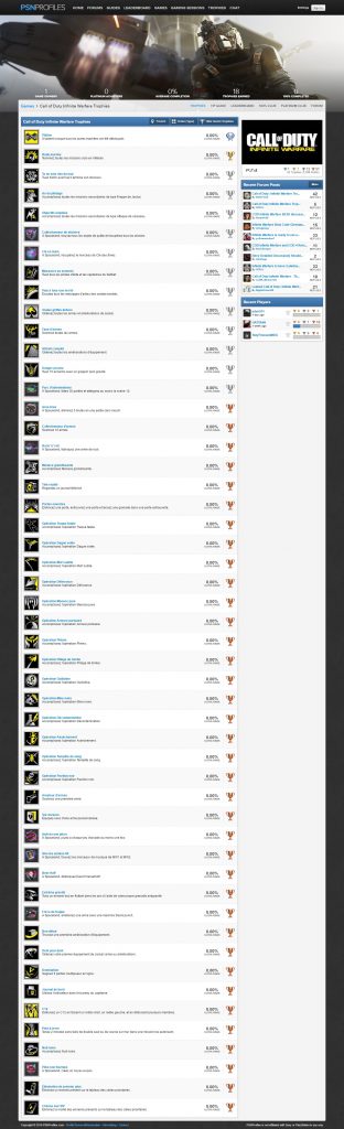 Comme d’habitude, c’est le site PSN Profiles qui nous présente l’intégralité des récompenses qu’il sera possible d’obtenir à travers les modes solo et multijoueur du titre de Infinity Ward. Sur PS4, il y aura un trophée or, douze en argent et trente-sept de bronze pour un total de 51 trophées. Voici une capture d’écran de cette liste mais vous pouvez également vous rendre directement sur PSN Profiles pour profiter d’une meilleure lisibilité.