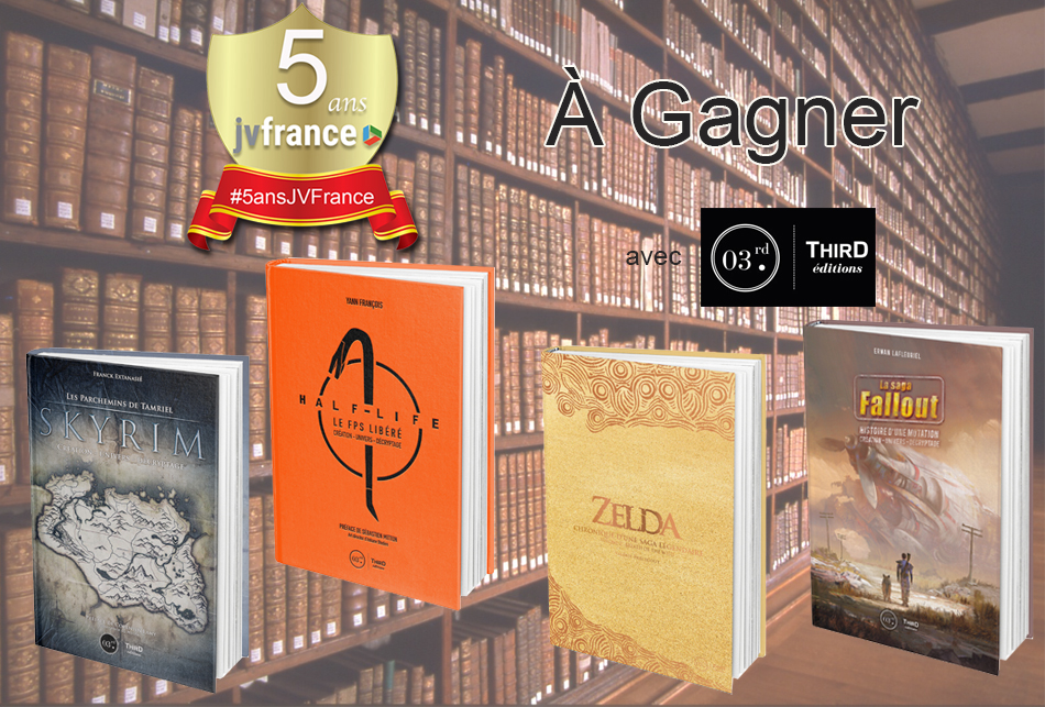 A l’occasion des cinq ans du site, Third Editions et JVFrance sont heureux de vous offrir un ensemble de livres dédiés à quelques-uns des titres majeurs de l’histoire du jeu vidéo : The Elder Scrolls Skyrim, Half-Life, Zelda et Fallout.