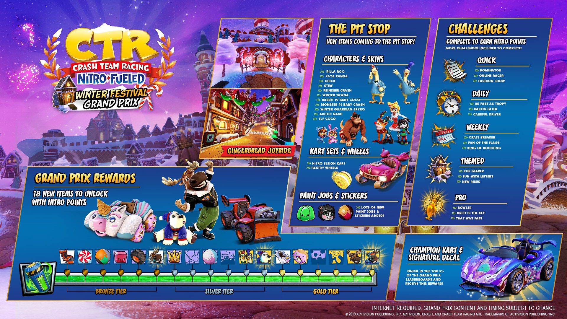 - 18 nouveaux items Grand Prix (karts, peintures, autocollants, décalcos, personnages et skins de personnages) à débloquer en remportant des Points Nitro. Pour cela, il suffit de jouer aux différents modes de jeux solo comme multi mais aussi et surtout de réaliser les différents défis (rapides, quotidiens, hebdomadaires, thématiques et professionnels) disponibles.
