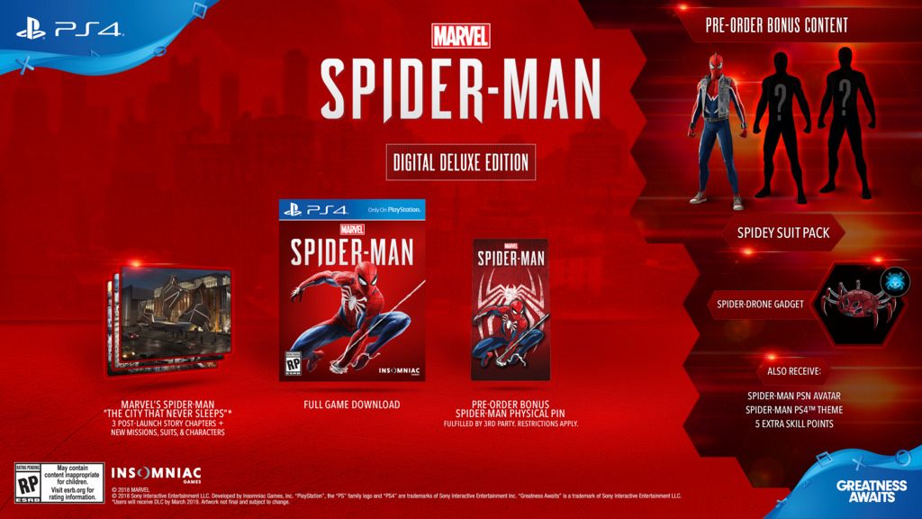 Une édition Deluxe Digital sera également de la partie. Pour les deux, un bonus de pré-commande offrira trois costumes – incluant par exemple Spider-Punk – ainsi qu’un petit gadget, un avatar, un thème PlayStation 4 et 5 points de skill pour améliorer Spider-Man.