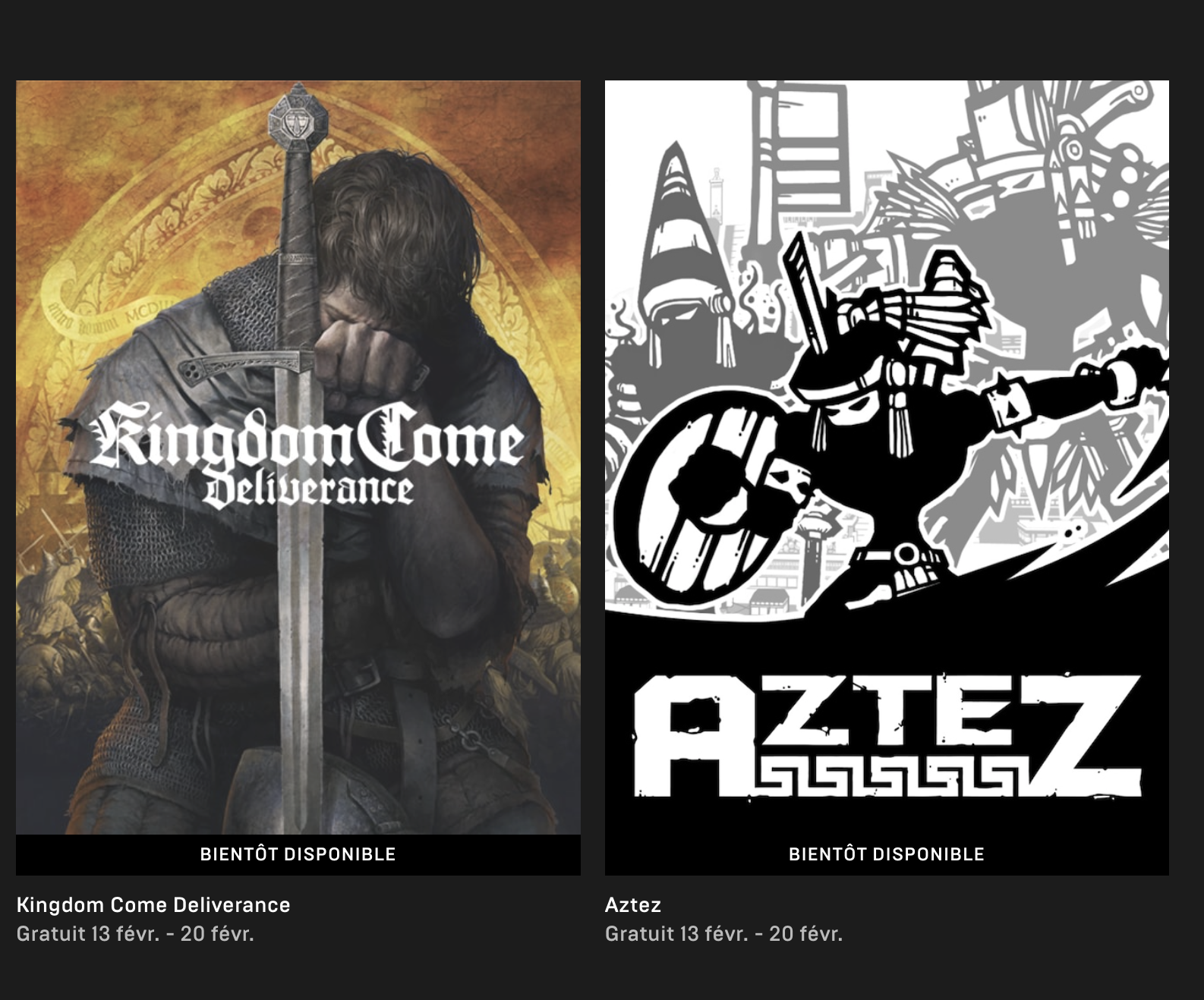 Il y a peu de temps, nous apprenions la sélection de jeux offerts par la plateforme Epic Games Store pour le début du mois de février : Ticket to Ride et Carcassonne, disponibles jusqu’au 13. En plus de ces deux titres, Pandemic était également prévu au programme mais l’offre a été malheureusement annulée il y a quelques jours. Ce n’est pour autant qu’ils en restent là car les deux prochains titres offerts pour ce mois-ci viennent d’être révélés sur la Toile : il s’agit de Kingdom Come: Deliverance et Aztez. Ils seront disponibles gratuitement du 13 au 20 février.