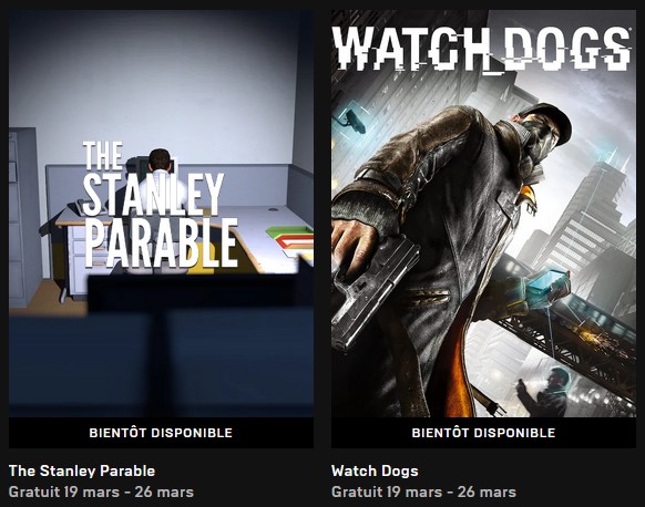 Certaines semaines, les jeux mis en avant sont des petits jeux méconnus et bien souvent indépendants qui bénéficient grâce à cette formule d’une visibilité sans doute fortement appréciée par les studios qui ont travaillé dessus. D’autres semaines, Epic Games sort l’artillerie lourde en proposant de gros jeux, parfois même des AAA, pour le plus grand bonheur des joueurs. Ce sera le cas du 19 mars au 26 mars avec l’arrivée de Watch Dogs et The Stanley Parable.