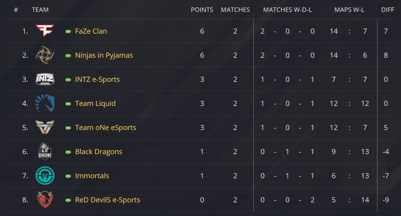 Le classement à l’issue de cette deuxième journée de match est disponible ci-dessous, plaçant FaZe Clan et Ninjas in Pyjamas en tête.