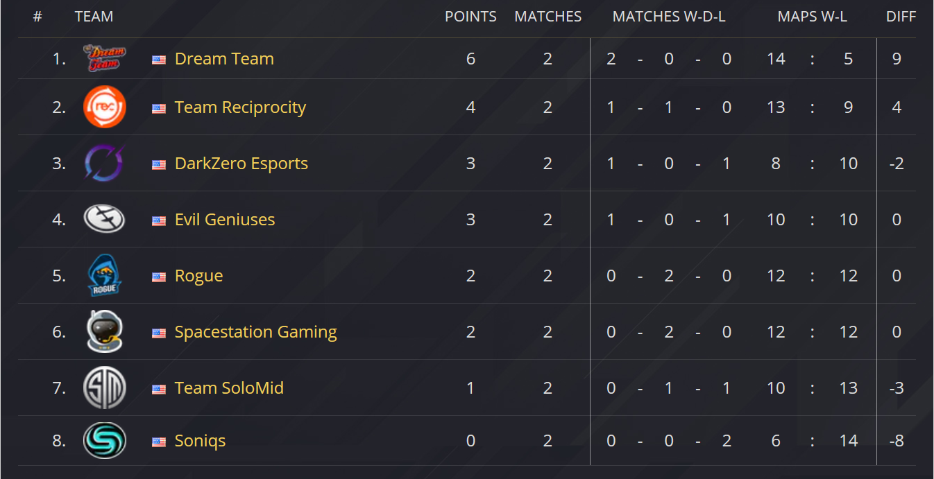 Pour débuter cette deuxième journée de Pro League NA, les joueurs de la Team Reciprocity ont rencontré les joueurs de Rogue. Ce premier match s’est déroulé sur Villa et s’est terminé sur une égalité parfaite, soit sur le score de 6-6. Ensuite, les joueurs de Spacestation Gaming ont affronté la Team SoloMid sur Villa également. Cette rencontre s’est clôturée aussi sur une égalité parfaite. Pour le troisième match de cette soirée, Evil Geniuses ont défié les joueurs de Soniqs Esports sur Café Dostoyevsky. L’équipe canadienne a su montrer sa supériorité en s’imposant sur le score de 7-3. Pour clôturer cette deuxième journée, le dernier match opposait les joueurs de DarkZero Esports face à ceux de 92 Dream Team. Le duel s’est déroulé sur Frontière, où les joueurs de 92 Dream Team se sont largement imposés avec le score de 7-1.