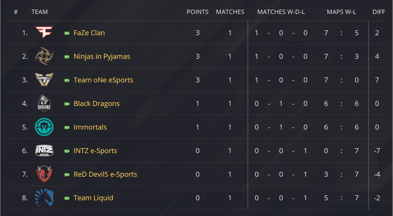 Pour le premier match de cette première journée de Pro League LATAM, la Team oNe eSports ont affronté les joueurs de INTZ eSports Club. Le match s’est déroulé sur Club House et s’est terminé par une large victoire de la Team oNe eSports, avec un score de 7-0. Ensuite, est venu au tour des joueurs du FaZe Clan face à la Team Liquid sur Café Dostoyevsky. Cette rencontre s’est terminée par la victoire du FaZe Clan sur le score de 7-5. Pour le troisième match de la soirée, les joueurs de Ninjas in Pyjamas s’offrent la victoire face aux joueurs de ReD DevilS e-Sports sur Frontière, avec le score de 7-3. Pour terminer, le dernier affrontement a eu lieu sur Banque et opposait les joueurs de Black Dragons e-Sports face à ceux d’Immortals. Ce match s’est terminé sur une égalité parfaite, soit sur le score de 6-6.