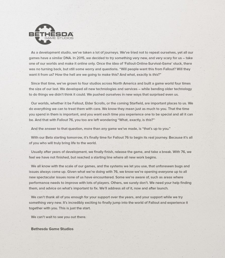 En effet, Bethesda vient de publier une lettre aux fans sur les problèmes que l’on pourrait rencontrer en jouant à Fallout 76, sur la bêta – commençant d’ailleurs aujourd’hui sur Xbox One et un peu plus tard sur les autres machines – et, sans doute, le jeu complet :