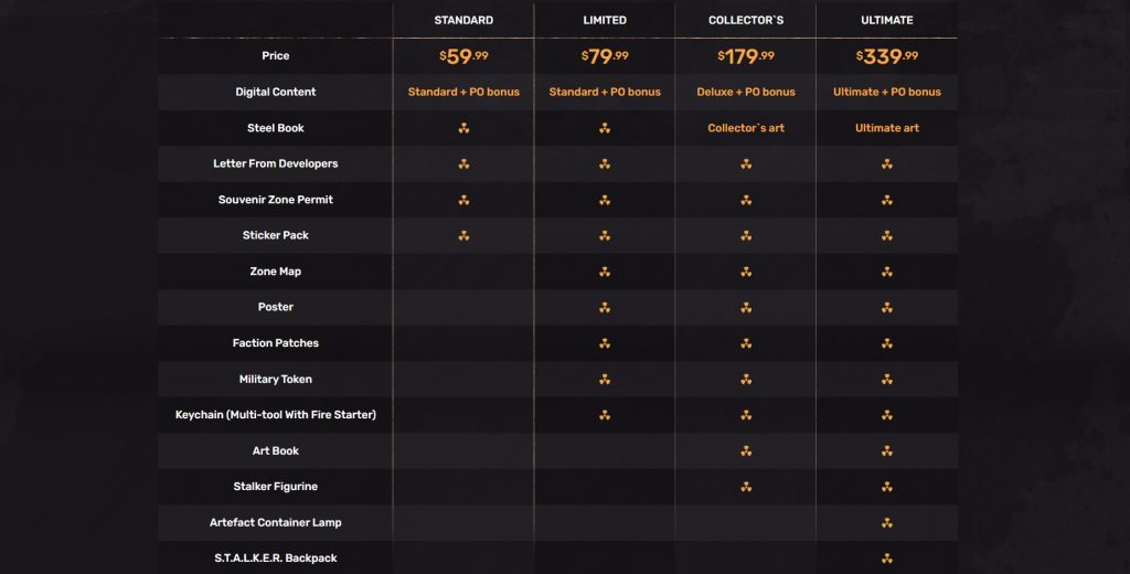 Trois éditions seront disponibles pour S.T.A.L.K.E.R.2.: Heart of Chernobyl pour la version Digitale et quatre pour la version physique. Afin de connaitre le contenu pour chaque édition, vous pouvez vous référer aux images ci-dessous.