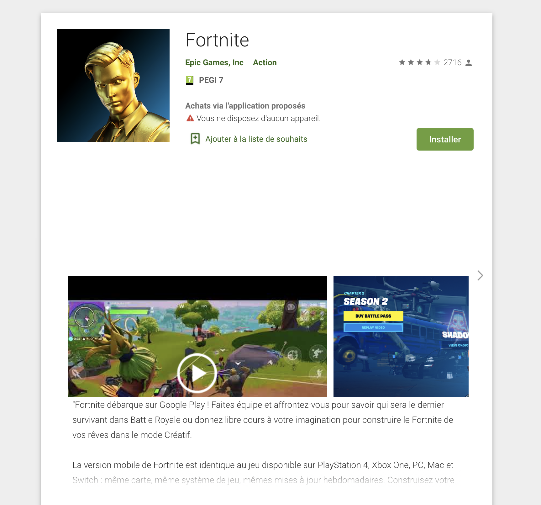 Mais depuis quelques heures, et plus précisément depuis ce mardi 21 avril, les choses ont changé. En effet, Epic Games a récemment cédé face au géant Google et propose désormais de télécharger gratuitement Fortnite Battle Royale directement depuis le Play Store. Ainsi, les joueurs peuvent désormais télécharger le soft pour leur smartphone et tablettes en toute simplicité et sans effectuer des manipulations supplémentaires compliquées. D’ailleurs, il suffit de se rendre à cette adresse depuis votre appareil pour lancer le téléchargement du jeu.