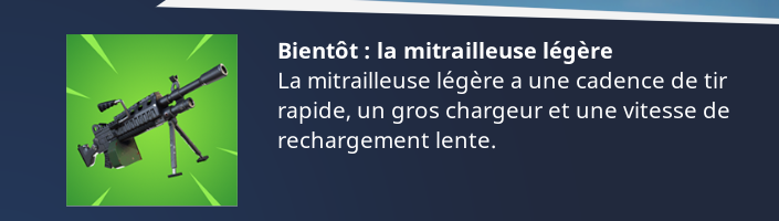 Cette nuit, la boutique d’objets a été mise à jour, ainsi que le fil d’actualité présent après la connexion au jeu. Répertoriant toutes les annonces et événements à venir, les joueurs ont découvert ce matin l’arrivée d’une toute nouvelle arme qui ne devrait pas laisser indifférent : la mitrailleuse légère. La description de cette arme étant la suivante : « La mitrailleuse légère a une cadence de tir rapide, un gros chargeur et une vitesse de recharge lente », elle ferait 25 points de dégâts à bout portant et environ 17 à distance. Selon les dernières informations, il s’agirait d’un item rare et épique, donc plus difficile à trouver que les autres armes types fusil d’assaut et fusil à pompe.