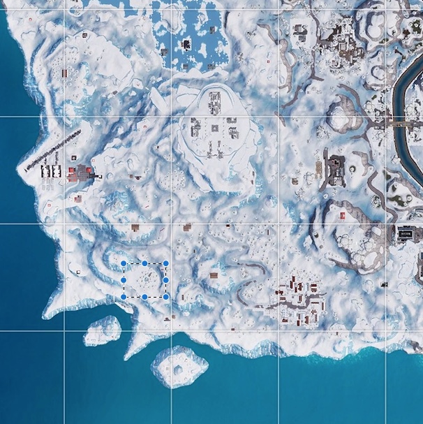 Cette semaine l’écran de chargement est tout de même assez énigmatique, et met en scène notre cher ami le Troll prenant le thé avec ses amis. Il se trouve dans une grotte ou une caverne glacée. Premier élément révélé, indiquant nécessairement le Sud Ouest de la carte. Mais il en faudra bien plus pour connaître la position exacte. Cet endroit se trouve à mi-chemin entre Frosty Flights et Happy Hamlets, près d’un petit lac entouré d’arbres, situé en B9. Difficile à trouver si l’on ne connaît pas cette zone de la carte comme sa poche, ainsi voici donc une image qui devrait vous aider dans vos recherches et vous pointe l’endroit précis où trouver la bannière cachée/étoile secrète de la semaine 5 (encadré bleu).