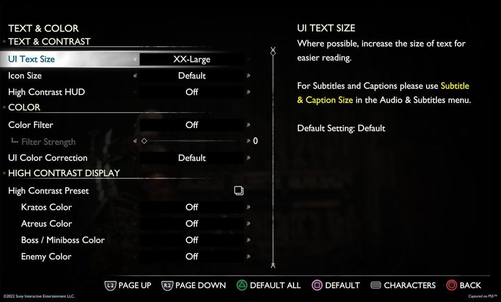 La personnalisation des sous-titres a été repensée afin de proposer aux joueurs, une plus grande accessibilité. En outre, il sera désormais possible de modifier la taille de ces derniers ainsi que des icônes jusqu’à un format XL afin de les voir plus facilement. De même, la couleur pourra être modifiée en fonction de l’interlocuteur ou d’autres préférences. Le nom de l’interlocuteur pourra être affiché permettant aux joueurs de mieux distinguer chaque personnage. Il sera également possible d’y incorporer les effets sonores du jeu, ce qui devrait permettre aux personnes malentendantes de mieux suivre le récit de Kratos et Atreus.