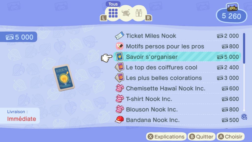 Ayant rajouté une nouvelle monnaie, soit les Miles Nook, les développeurs ont implanté un distributeur dans le Bureau des Résidents. En s’y connectant, il est proposé d’échanger des Miles Nook contre différents items, notamment des vêtements, des plans de bricolage et bien d’autres. Une entrée devra absolument attirer votre attention si vous cherchez à augmenter votre inventaire. Il s’agit de la carte représentant une ampoule portant le nom « Savoir s’organiser ». Elle coûte 5 000 Miles Nook. En l’achetant, votre personnage apprendra de lui-même cette nouvelle connaissance. Se faisant, vous obtiendrez ainsi une troisième ligne d’emplacements dans votre inventaire. Bien entendu, il faudra tout d’abord parvenir à récolter la somme demandée, ce qui ne sera pas si compliqué que cela si vous suivez nos quelques conseils proposés dans ce guide (à cette adresse).
