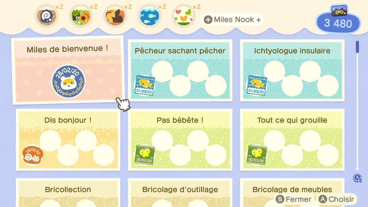 Toujours dans l’idée d’accomplir des missions diverses, amusez-vous avec les nombreuses fonctionnalités de cet opus. Il va s’en dire que vous le ferez très naturellement. Dans une liste non-exhaustive, voici les actions qui peuvent être accomplies pour gagner facilement et rapidement des Miles Nook : poster un premier message sur le panneau d’affichage, utiliser l’application des motifs perso pour changer un décor, implanter des éléments décoratifs sur l’île et dans votre maison, acheter et vendre des items, prendre sa première photographie, effectuer son premier voyage, envoyer sa première lettre…