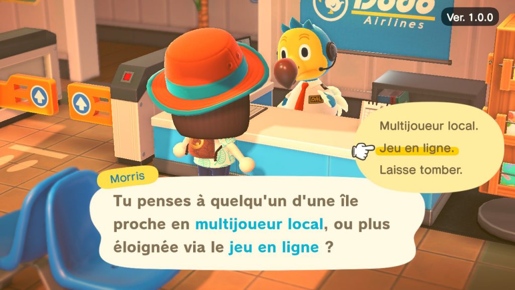 Si le Party Play local est une réelle nouveauté dans cet opus, ce n’est pas le cas du mode multijoueur en ligne. Pour jouer en ligne dans Animal Crossing: New Horizons, il faudra se rendre à l’aéroport de Dodo Airlines, positionné sur la côte de l’île. En discutant avec le PNJ, vous aurez ainsi l’opportunité de choisir entre utiliser une connexion locale (deux consoles sont alors nécessaires) ou inviter un ami directement en ligne. Sachez tout de même que cette opération nécessite absolument un abonnement au Nintendo Switch Online.