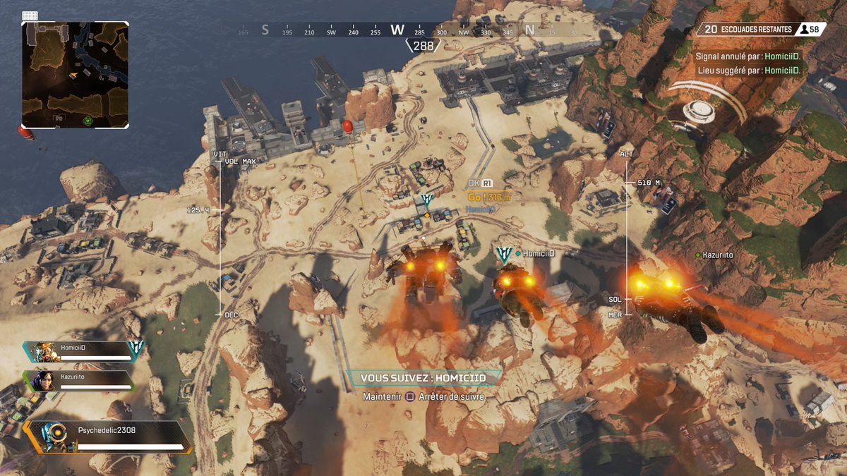 Dans Apex Legends, le choix de la destination d’atterrissage change un peu des autres Battle Royale. Dans celui-ci, un membre de l’escouade est désigné comme « chef de saut », au début de la partie. C’est lui qui indiquera, grâce à un marqueur, votre lieu d’atterrissage et contrôlera ainsi votre sortie de l’avion. Les deux autres joueurs de l’escouade peuvent décider de suivre sa décision ou de proposer une autre zone d’atterrissage. Néanmoins, dans le premier cas, le chef de saut est celui qui dirige toute l’équipe vers le marqueur, si tous les membres sont d’accord avec sa décision. Il est tout de même possible de passer en mode contrôle libre, et vous serez alors votre propre maître.