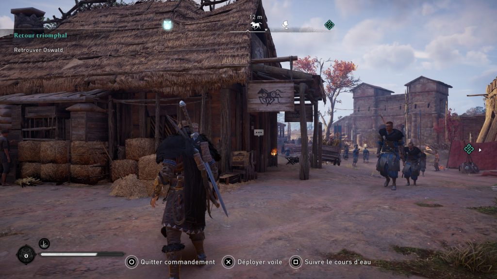 Assassin’s Creed Valhalla ne disposant pas de menu in-game ou d’emplacement d’inventaire affilié à la monture, il faudra s’intéresser à un PNJ en particulier afin d’augmenter les statistiques du cheval. En effet, au détour de villes et villages, vous pourrez voir apparaître sur votre boussole un symbole représentant un cheval au galop. En se dirigeant vers ce point d’intérêt, vous rencontrerez un PNJ dirigeant une écurie.