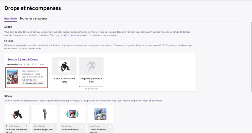 Voilà, vous avez accès à une multitude de lives avec la mention Drops dans leurs titres. Ces lives sont donc sponsorisés par Blizzard et vous donneront accès à deux éléments cosmétiques : un spray ainsi qu’un skin exclusif pour Ramattra. Il ne suffira pas d’enclencher le live pendant quelques secondes pour mettre la main sur le contenu, cependant. Il faudra regarder un stream un certain nombre d’heures donnée : 2 heures minimum pour le spray et 6 heures pour le skin. Si vous quittez un stream pour un autre en cours de route, pas de panique ! Votre temps de visionnage est comptabilisé de façon général, et vous n’aurez pas à repartir de zéro.