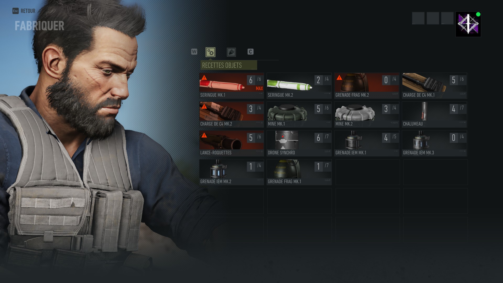 Rendez-vous ensuite à un bivouac (notre guide à ce sujet) afin de vous occuper de vos équipements de soutien. Fabriquez tout ce dont vous pourrez avoir besoin en quantité maximum afin de ne pas tomber en rade trop vite. Dans le cas présent, privilégiez surtout les grenades explosives et les grenades IEM de niveau MK.1, MK.2 et MK.3 pour l’offensive, puis les seringues de niveau MK.1 et MK.2 pour la défense. En toute logique, si vous vous en sortez bien, cela devrait suffire. N’hésitez pas également à vous crafter quelques rations de survie. En l’occurrence, la Ration protectrice vous permettra d’obtenir un bonus de 5% de résistance aux dégâts pendant 10 minutes, ce qui n’est pas négligeable. Si vous n’avez pas les ressources nécessaires pour fabriquer tout cela, vous pouvez toujours passer par la boutique pour les acheter pour la plupart.