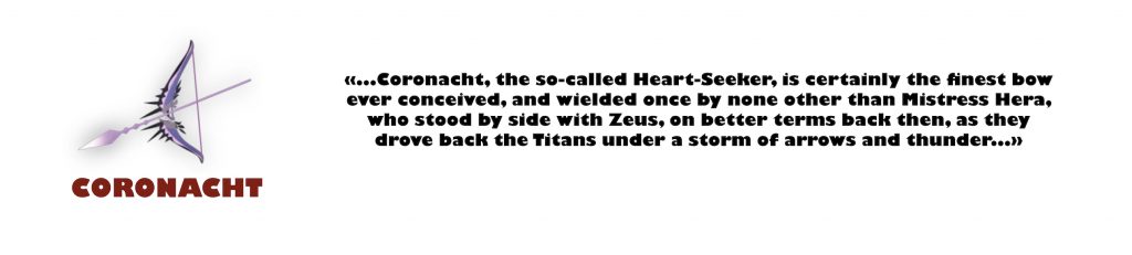 Avant possédé par Hera, Coronacht est un arc divin qu’il est possible de débloquer à l’aide de clés chthoniennes dans le hub correspondant, à la sortie de la maison d’Hades. Il s’agit, comme son design l’indique, d’une arme permettant le combat à moyenne et longue distance.