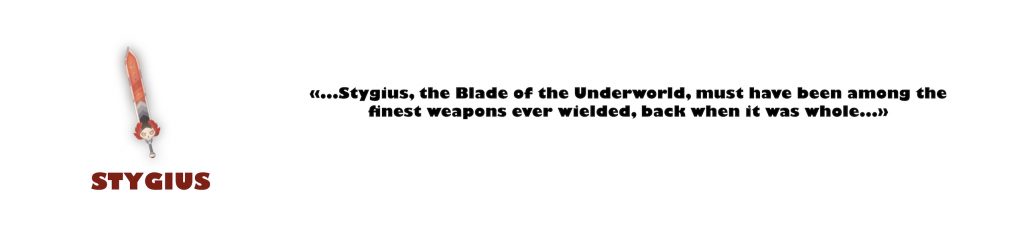 Stygius est une épée, dont le propriétaire était auparavant Poséidon. Il s’agit de la toute première arme, elle se débloque automatiquement. C’est d’ailleurs avec celle-ci que vous effectuez votre toute première run, exigeant ainsi d’être au corps-à-corps pour battre les ennemis.