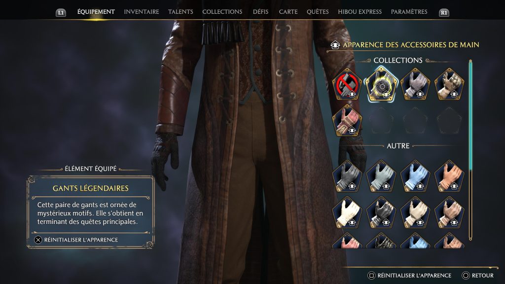 Les apparences d’équipement sont divisées en 2 catégories : les collections et les autres. Dans les collections, se trouvent les apparences relatives aux contenus téléchargeables (notamment pour ceux ayant pré-commandé le jeu, pour ceux ayant lié leur compte Pottermore et leur compte WB Games à leur console et ceux possédant l’édition Deluxe), et toutes les apparences des équipements obtenus.
