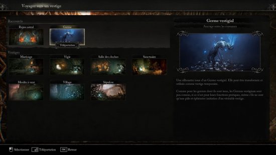 Afin de créer un vestige temporaire, il faudra trouver un parterre de fleurs et avoir une graine vestigiale. En activant votre lanterne et la touche correspondante, vous invoquerez un germe vestigial qui restera jusqu’à ce que vous en invoquiez un autre. Vous pourrez ainsi sauvegarder votre progression où que vous soyez.