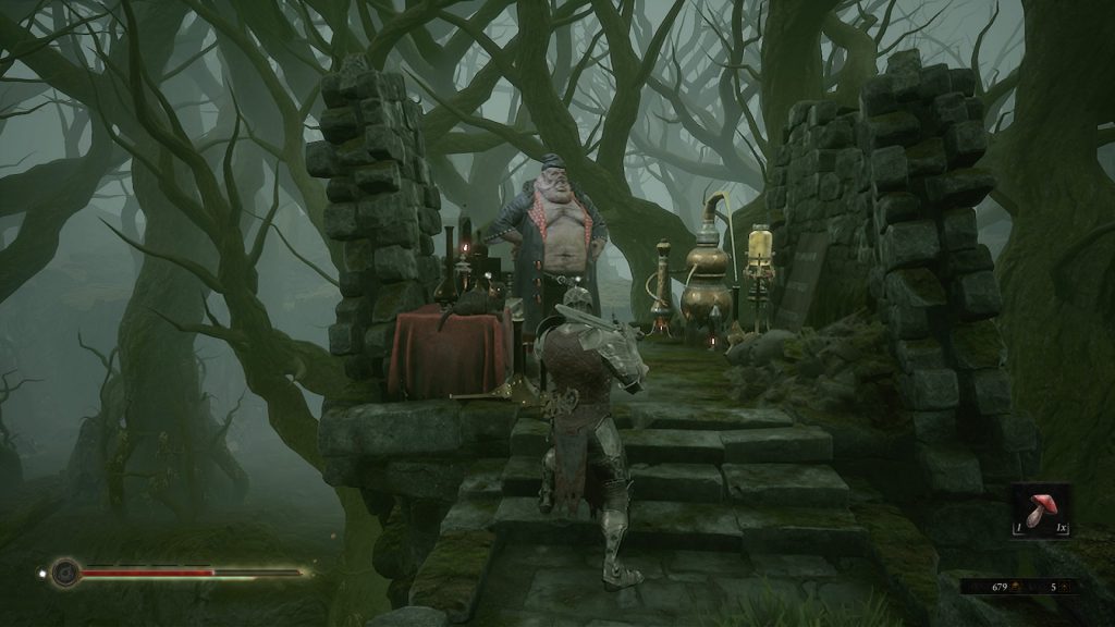 Elevé au rang de trophée de bronze, et donc relativement facile à obtenir, « Purrfect » demande tout de même d’accomplir certaines étapes et actions. En dessous du nom de ce trophée/succès, on retrouve la mention « Pet Vlas’s Cat », que nous pourrions comprendre en français comme ceci : « Caressez le chat de Vlas » tout simplement. Tout d’abord, il convient de savoir que Vlas est un marchand. Attention tout de même, pour ceux s’étant essayés à la démo du jeu, Vlas ne se situe pas au même endroit dans le jeu complet. En effet, celui-ci est à retrouver à Fallgrim, la première zone semi-ouverte marécageuse que nous avons à explorer au début du jeu, et près d’un lieu important (images ci-dessous).
