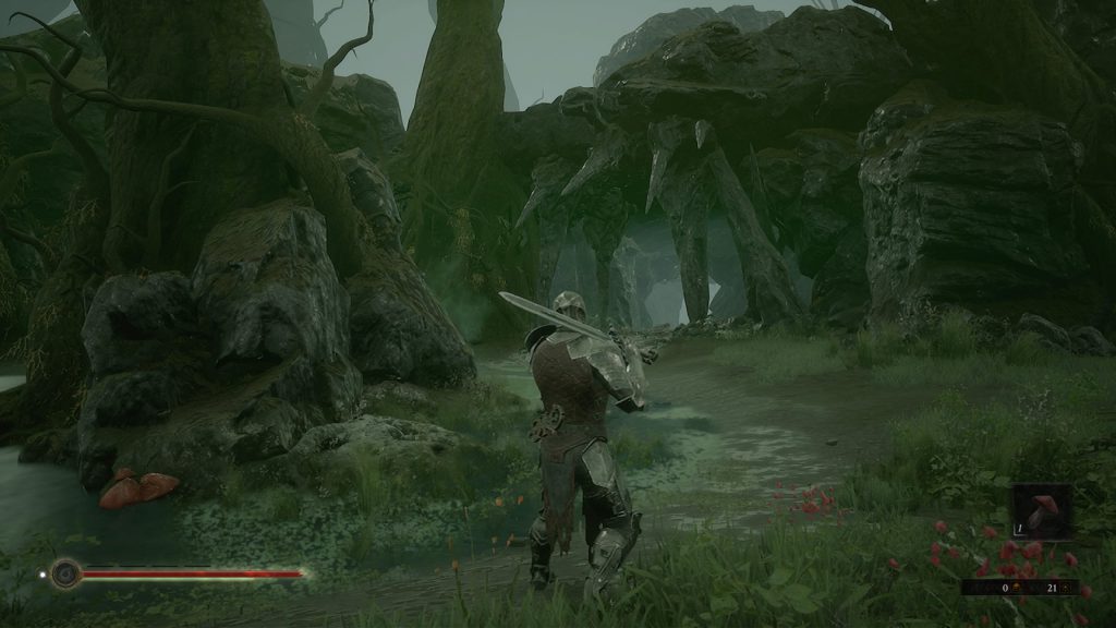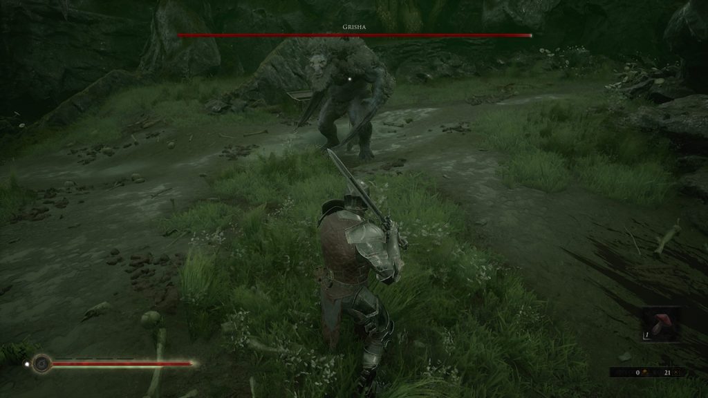 En ressortant de ce lieu par la porte en bois entrouverte, vous vous retrouverez face à une zone circulaire toujours marécageuse (première image ci-dessus). En face, vous verrez une ouverture gigantesque dans la paroi. Dirigez vous vers cet endroit en évitant les pièges à ours. Dans cette grotte, git Grisha. Faisant office de boss, Grisha garde un coffre. Deux choix s’offrent alors à vous : retroussez vos manches et tuez la bête ou bien courir et ouvrir le coffre avant de prendre la fuite. A votre guise, bien entendu, mais sachez que Grisha ne vous laissera pas vivre et piquer son trésor impunément. Vous voila prévenus.
