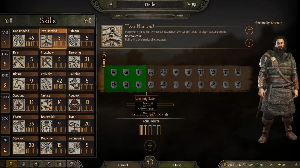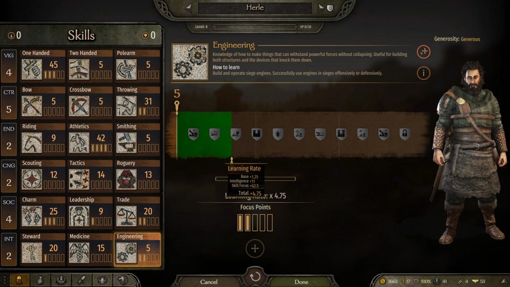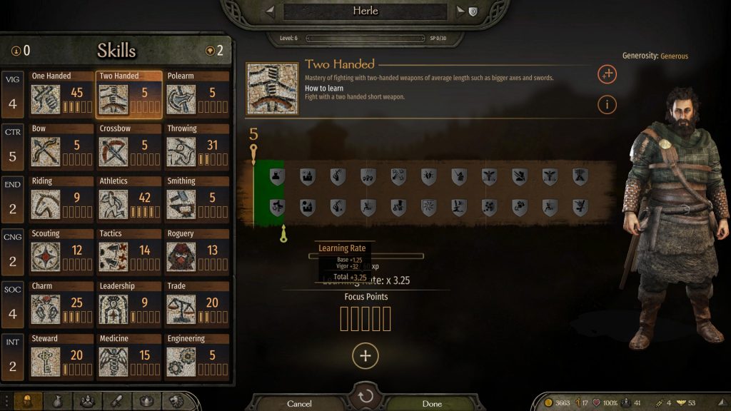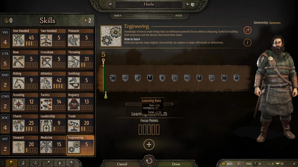 Pour bien dépenser ses points il est important de garder à l’esprit deux choses : nous le rabâchons , mais évitez de vous disperser en début de partie et concentrez-vous sur vos axes principaux. Ensuite, sachez que plus haut niveau vous êtes, plus de points talents seront nécessaires pour passer au prochain niveau. Logiquement donc, plus vous attendrez pour vous lancer dans une nouvelle branche, plus il vous sera difficile de la faire grimper rapidement. Pour pallier à ça, vous pouvez économiser vos points d’attribut et de talent, pour les dépenser une fois que vous êtes certain de vouloir vous investir dans l’une des sections. Si nous prenons en exemple les images ci-dessous, monter l’ingénierie alors que notre héros n’a que deux points d’intelligence en attribut se montre moins pertinent qu’investir deux points dans les armes à deux mains, le bonus d’apprentissage est moindre de 1,50x. Si notre personnage veut s’investir dans l’ingénierie il faudra au préalable dépenser quelques points attributs pour booster l’apprentissage.