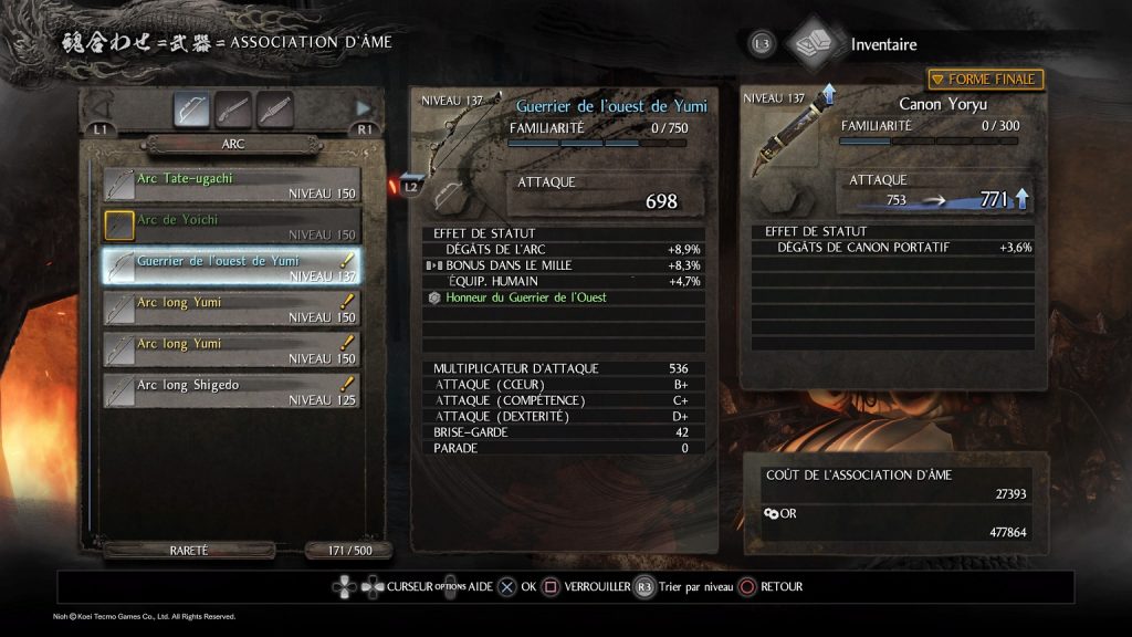Dans le cas des armes, l’association d’âme va vous permettre de réinitialiser la familiarité, histoire d’obtenir encore un objet plus puissant. Cela fonctionne bien évidemment avec les armures de niveau céleste (marquées en vert).