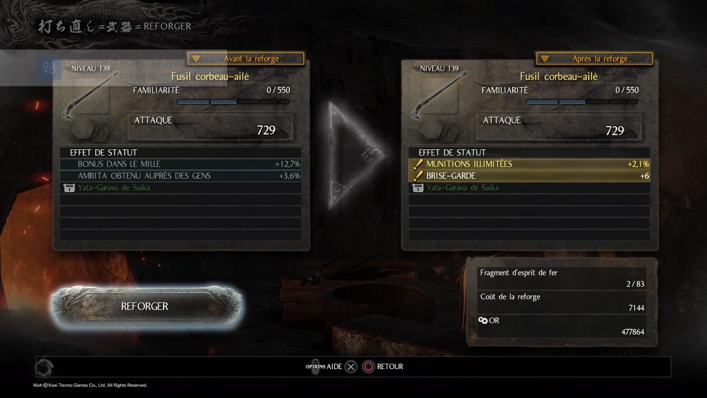 Par exemple, ici, la pièce d’armure va être fusionnée avec une autre du même type. Ainsi, le « insérer nom » gagnera en défense et sera par conséquent toujours utile face aux ennemis qui deviennent encore plus puissants. Ce procédé s’applique à toutes les armes et armures, à condition d’avoir l’argent nécessaire.