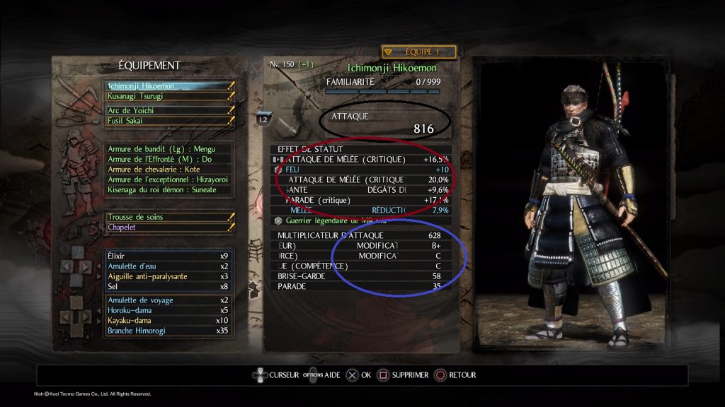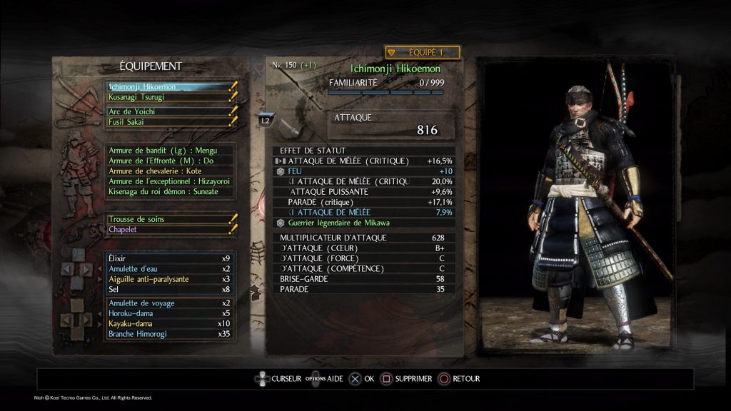 En premier lieu, il est très important de comprendre comment fonctionne la gestion de l’équipement dans Nioh. Très rapidement, vous allez vous apercevoir que le jeu tient beaucoup du hack ‘n’ slash, et notamment de Diablo 3. Au fur et à mesure de votre complétion des niveaux, vous allez ramasser énormément d’équipements, plus ou moins utiles et il ne faudra pas hésiter à aller régulièrement jeter un coup d’œil à votre Loot.