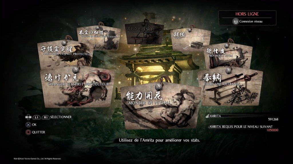 Dans chaque mission principale, vous remarquerez que le jeu vous indique le nombre de Kodama à récupérer. Ces petits êtres verts ont deux influences. La première est qu’ils vont vous permettre d’augmenter votre nombre de remèdes. Ainsi, plus vous allez trouver de Kodama, plus le nombre de remèdes rechargés au sanctuaire sera important. Ces petites créatures pourront également vous faire bénéficier d’une bénédiction qui aura pour impact d’augmenter le taux de drop sur les cadavres des ennemis du butin d’armures, d’armes, de remèdes ou d’Amrita. Le tout selon votre choix.