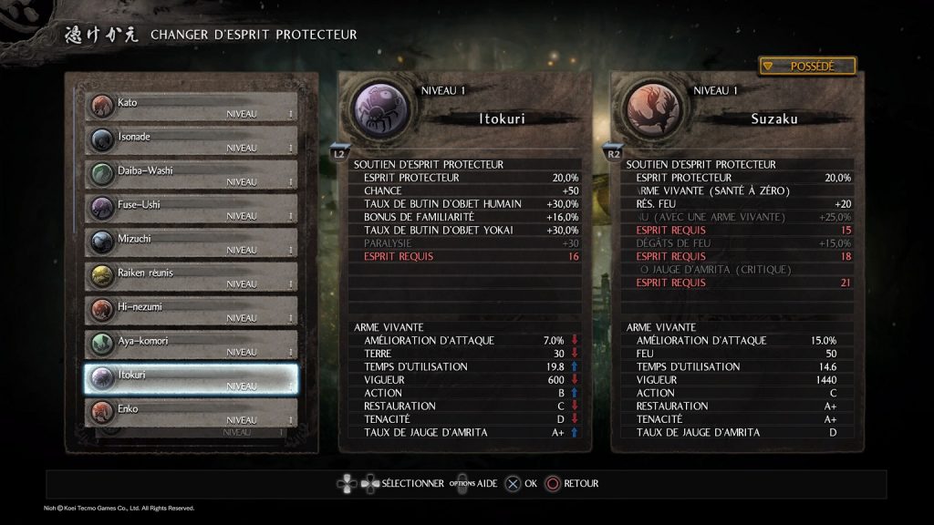 Les esprits protecteurs doivent également être pris au compte. En premier lieu, pour l’avantage qu’ils vont vous offrir au combat en déclenchant une furie, mais également pour des bonus passifs qui viendront augmenter les stats de votre personnage selon votre niveau d’esprit. Si vous n’avez pas le niveau suffisant dans la stat esprit, le bonus passif de votre protecteur ne pourra pas être pris en compte. Par ailleurs, certains bonus sont vraiment très efficaces, comme par exemple l’esprit qui va vous permettre d’augmenter la régénération de Ki ou encore celui qui va vous permettre de se déclencher au moment de votre mort et ainsi vous éviter le trépas.