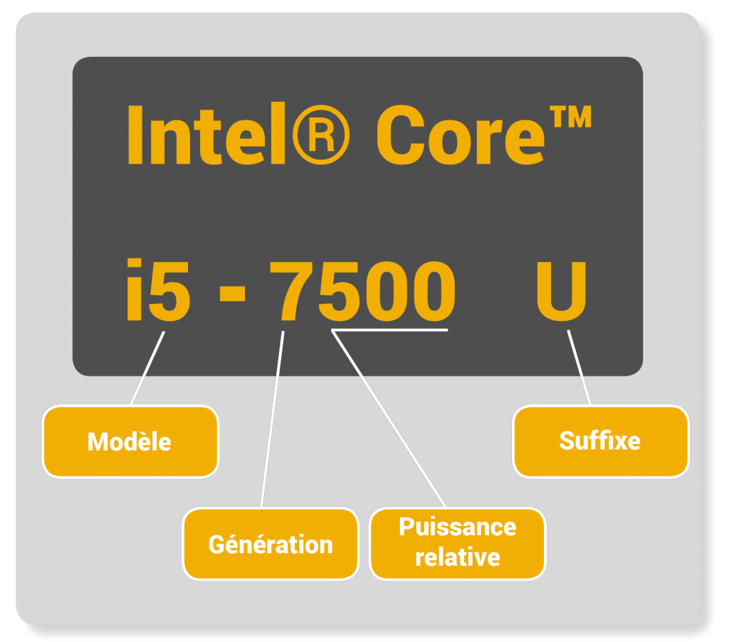 Les chiffres suivants correspondent à la puissance du processeur au sein de sa génération. Là encore, plus le chiffre est élevé plus le processeur à une position « haute » dans sa propre génération. Par exemple, on peut dire qu’un i5-6400 est moins puissant qu’un i5-6500.