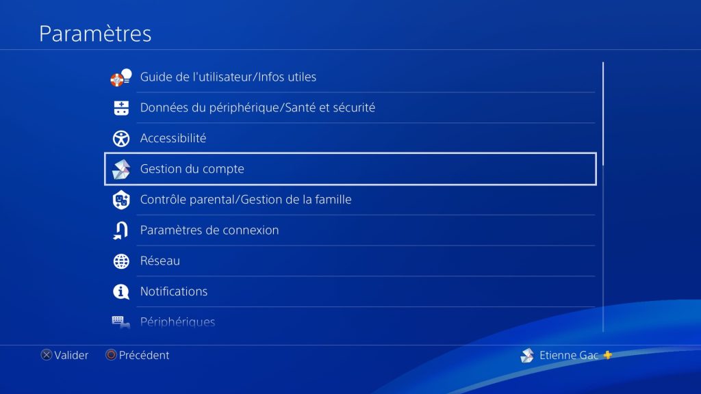 2) Une fois dans le menu Paramètres, cliquez sur Gestion du compte (avec votre avatar PlayStation Network).