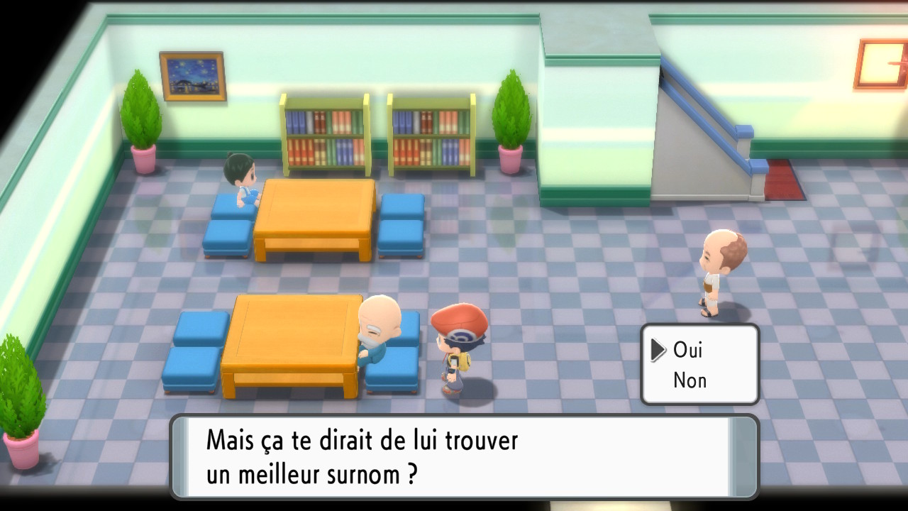 - Interagissez avec l’homme âgé assis sur votre droite. Il vous proposera d’évaluer les surnoms des Pokémon de votre équipe (et même ceux de votre PC).