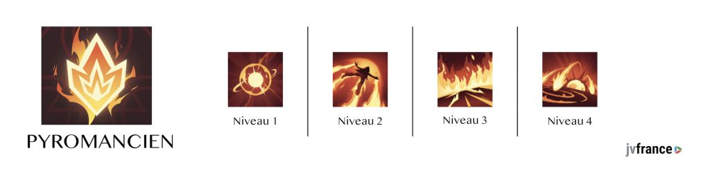Le Pyromancien profite du gant de pouvoir de feu. Les capacités sont les suivantes :