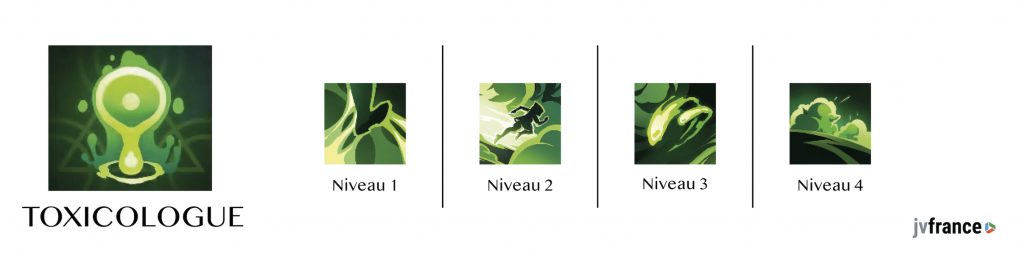La classe Toxicologue est affiliée au gant de pouvoir toxique. Comme son nom l’indique, cette classe joue sur le poison. Il y a 4 niveaux de pouvoirs et donc 4 compétences à débloquer.