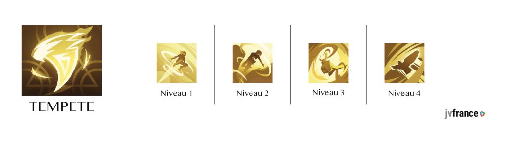 - Bourrasque : En restant plus longtemps dans les airs, les dégâts sont amplifiés. Ainsi, toutes les secondes passées en l’air infligent 10% de dégâts supplémentaires.