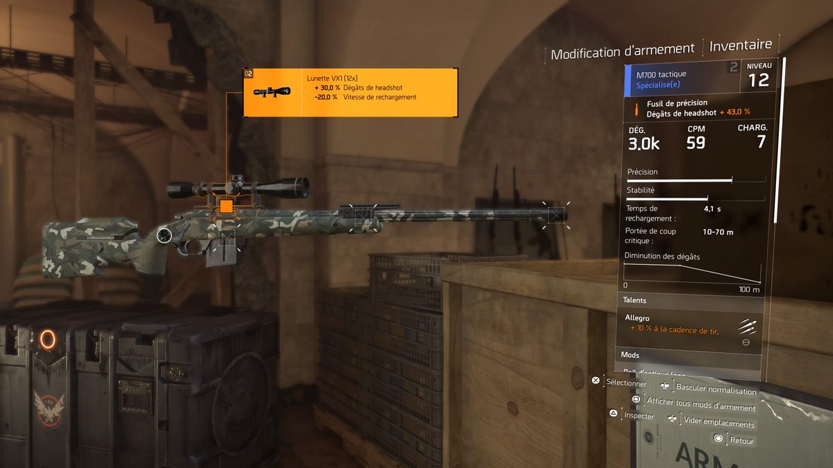 Prenons l’exemple de l’arme secondaire que nous utilisons en ce moment même (image ci-dessus). Le M700 tactique est un fusil de précision qui, au niveau 12 actuellement, offre 3.0K de dégâts. Ce qui n’est absolument pas négligeable. Une balle de cette arme bien placée sur votre ennemi, et sa vie sera réduite de moitié. En revanche, le CPM (coup par minute) est moins important et très souvent le chargeur n’est pas très grand. Dans le cas présent, la M700 tactique emporte 7 balles dans son chargeur. Et c’est relativement long de sortir l’arme, viser et recharger. Utilisez donc cette arme quand vous êtes à couvert et avez le temps de la dégainer correctement. Bien entendu, vous pourrez lui ajouter, par la suite, un chargeur offrant par exemple +10% de vitesse de rechargement (et encore il ne s’agit pas là d’un chargeur très important).