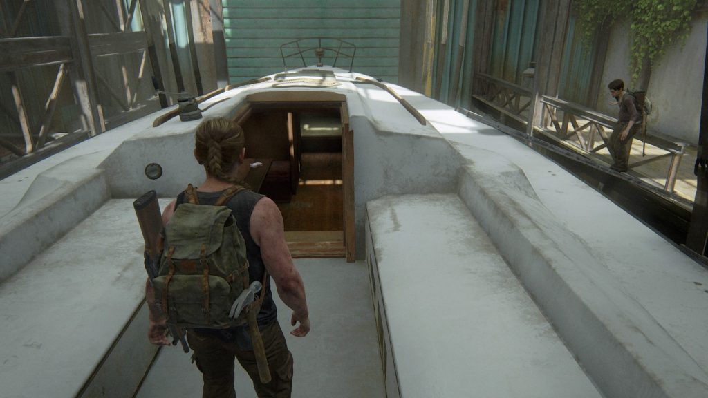 Pour sortir de ce lieu et ainsi progresser dans l’histoire, il est nécessaire de grimper sur le bateau en question. Mel devra d’ailleurs vous aider afin d’ouvrir une porte verrouillée au premier étage. Ceci étant fait, rejoignez la à l’étage. Utilisez l’échelle pour parvenir sur le bateau. Avant d’envoyer la corde et ainsi rejoindre la deuxième échelle jaune à droite, via une lucarne, pénétrez à l’intérieur du bateau. Vous y trouverez le manuel d’entraînement Opérations secrètes, disposé sur la table. Il s’agit d’un des emplacements possibles pour ce document.